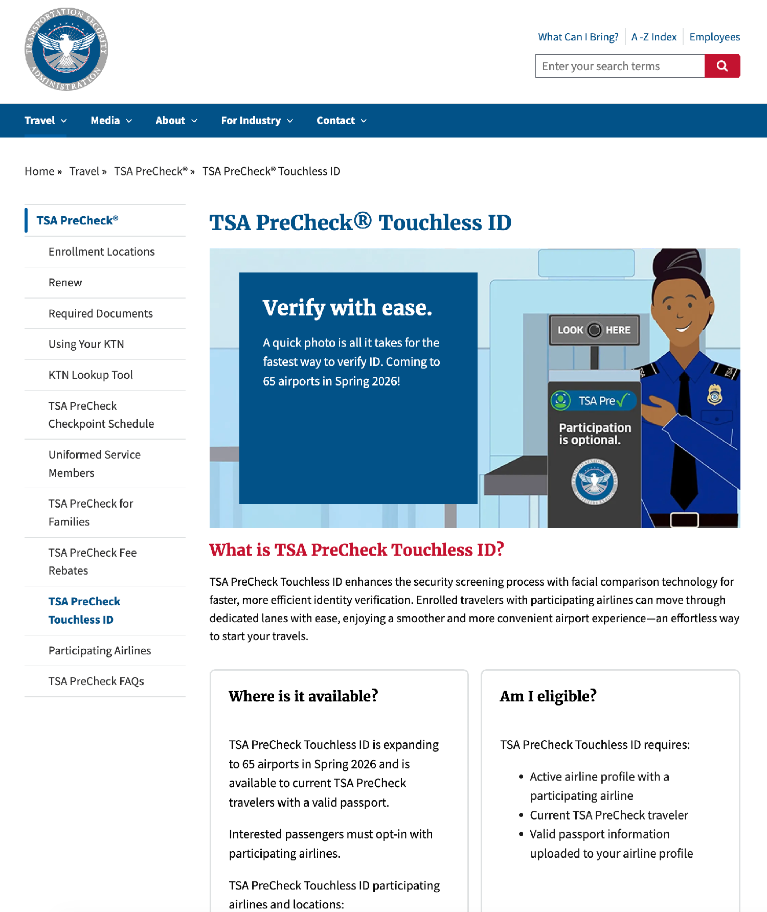 对海外华人来说,更实用的一点在于:Touchless ID并不额外收费。只要你本身拥有TSA PreCheck或Global Entry资格,并且乘坐支持该系统的航空公司航班,就可以免费使用这项服务。