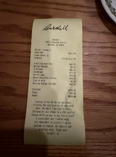 据《SFGate》报道,一则已被删除的Reddit帖子在网上走红,指出加州奥克兰的灵魂料理餐厅 Burdell(入选《米其林指南》)在收据底部附上一段“立场声明”,呼吁顾客接受自动服务费制度。