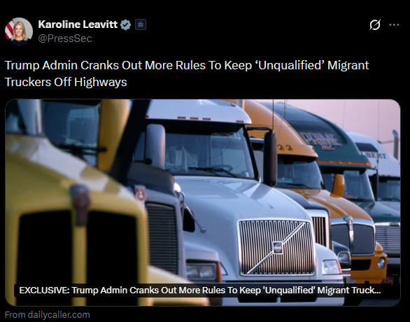 美国交通部长肖恩·达菲对此表示:“长期以来,美国允许存在安全隐患的外国司机滥用我们的卡车执照系统,给公路安全带来了极大隐患。这个安全漏洞今天将被彻底封堵。”