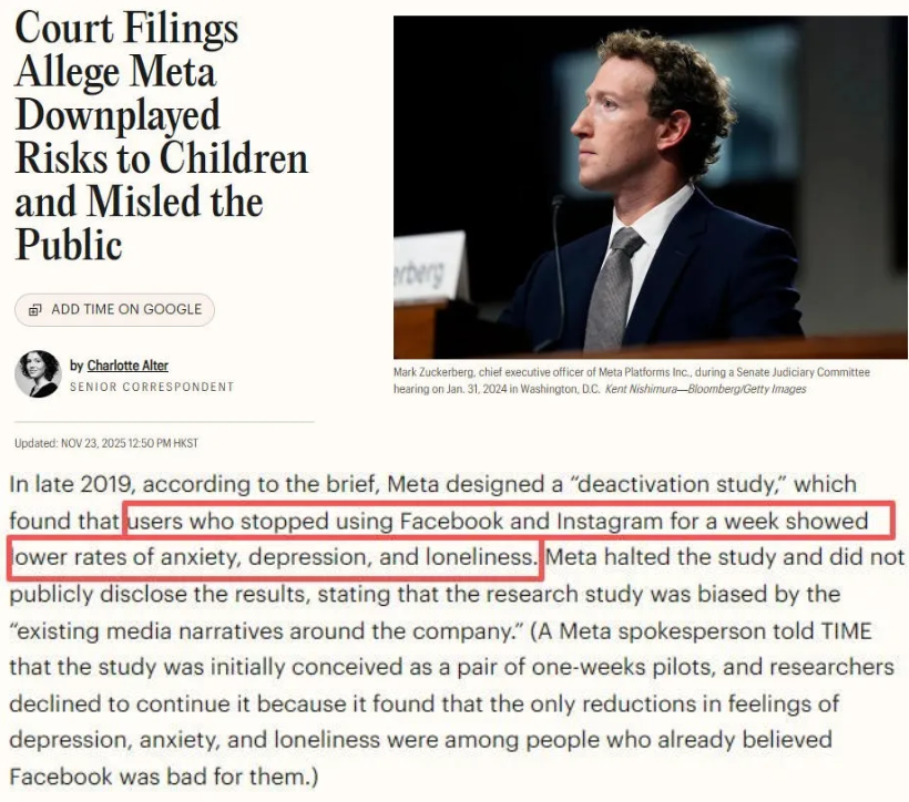 包括去年11月,《时代》杂志曾经研究过一封235页的法庭文件,说Meta早在2019年就进行过一项研究,最后发现用户仅需停用ins或脸书一周,焦虑、抑郁和孤独感便会出现下降。