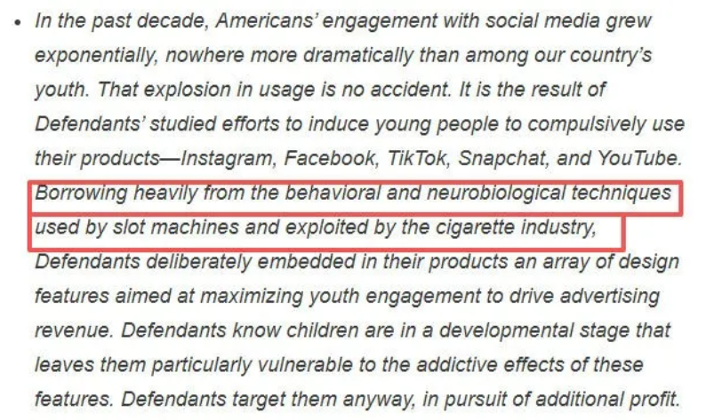 原告拼命想证明的正是这一点——社交媒体是新时代的“赛博烟草”。甚至社媒比烟草更为恶劣,因为烟草的成瘾性是天然的,社媒却是人为设计的。