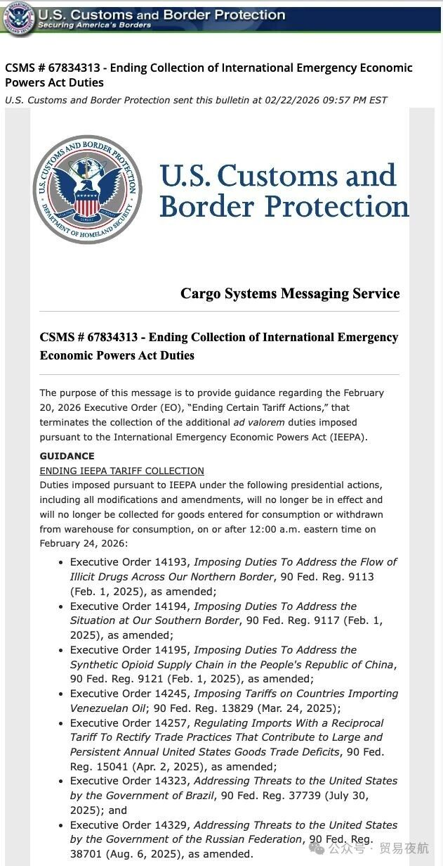 美东时间2026年2月22日晚上9:57,对应北京时间2月23日上午10:57,美国海关官网发布了正式公告,终止特朗普根据《国际紧急经济权利法案》(IEEPA)征收的关税,包括对等关税和芬太尼关税。