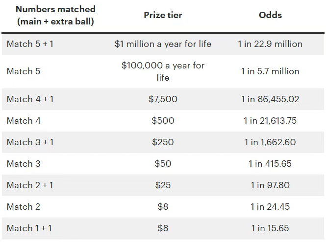 中任何奖的概率为1/8.46,比Powerball(1/24.87)和Mega Millions(1/23)高出约三倍。