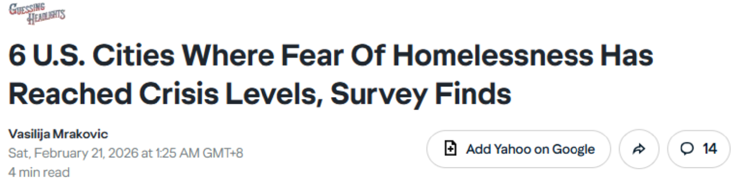 据yahoo news2月21日报道 旅行常常令人心情愉悦,但大城市的现实状况有时也会带来负面感受。在美国多个主要城市,居民调查以及联邦要求的即时统计数据均指向同一场危机:住房不稳定、街头可见的困境,以及公众因问题长期存在而产生的疲惫情绪。