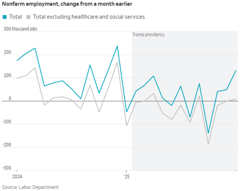 2026年1月,劳动力市场出现回暖迹象,雇主新增13万个岗位,远高于经济学家的预测。但除医疗与社会服务领域的增加以外,其他行业的招聘仍然疲软。