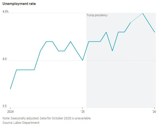 通常情况下,招聘大幅放缓会推高失业率。但这一次情况有所不同。去年全年失业率虽略有上升,11月一度升至4.5%,随后回落至上月的4.3%,但从历史标准来看,这些数字仍属较低水平。
