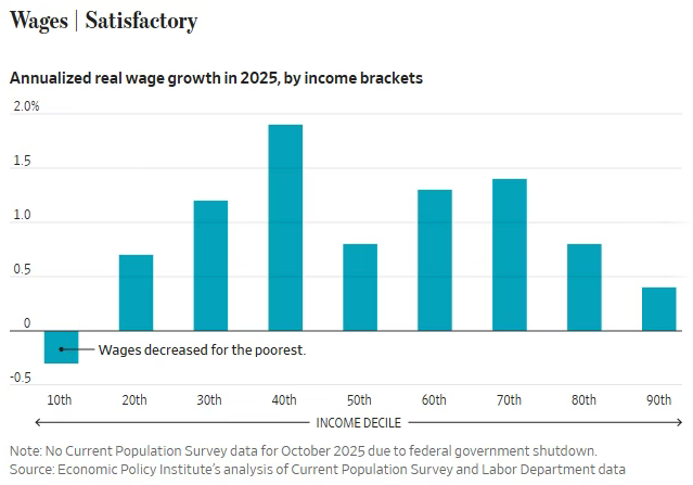 总体而言,截至今年1月的12个月内,实际工资增速略高于此前12个月。这种韧性,加上低失业率,有助于解释为何消费者支出保持稳健,从而支撑经济增长。但情况并非全面向好。经济政策研究所(Economic Policy Institute)基于人口普查数据的研究显示,2025年最低收入群体的实际工资出现下降。