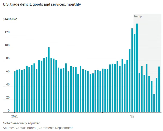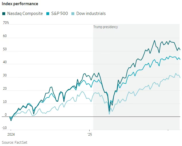 4月“解放日”新关税出台时,市场一度剧烈震荡,但跌势短暂。标准普尔500指数自4月低点以来上涨逾三分之一,投资者纷纷涌入与人工智能相关的股票;道琼斯工业平均指数近日首次突破5万点大关。这对经济而言是利好消息:股市上涨提升家庭财富,从而支撑消费支出。