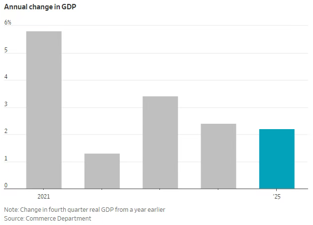 2025年国内生产总值(GDP)按同比第四季度计算增长2.2%,低于2024年的2.4%,为2022年以来最慢增速。秋季创纪录的政府停摆拖累了最近一个季度的增长。