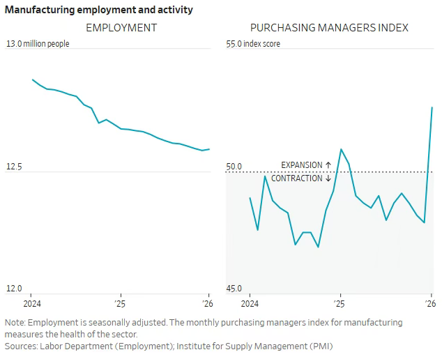 不过,尽管就业疲弱,美联储数据显示制造业产出同比增长2.6%。今年1月制造业就业亦略有回升。美国供应管理协会(Institute for Supply Management)的月度制造业活动指数也自2025年2月以来首次出现扩张。