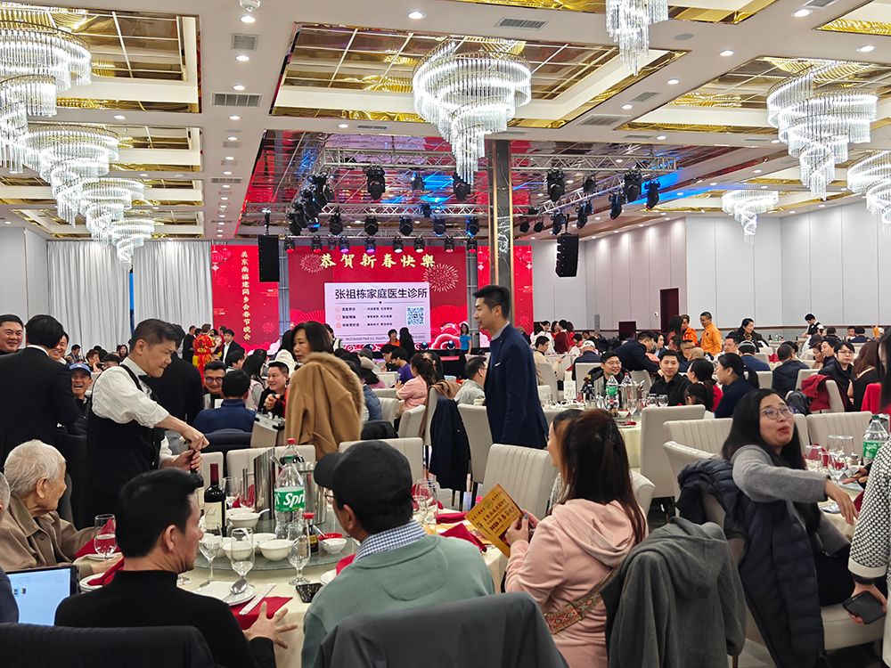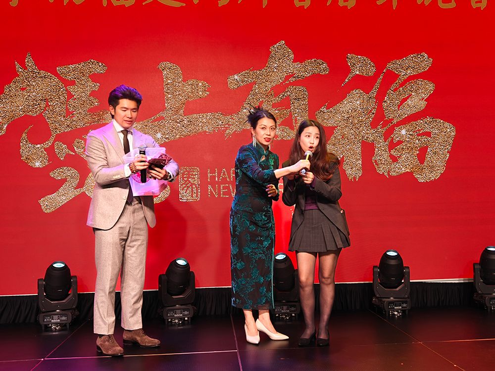 晚会还准备了丰富的抽奖环节。部分嘉宾应邀上台抽奖,现场气氛热烈。此外,大丰收餐馆、老四川餐馆、郑巧玲会计师楼、魏心牙医诊所等福建籍商家也提供了餐饮和服务代金券作为奖品。