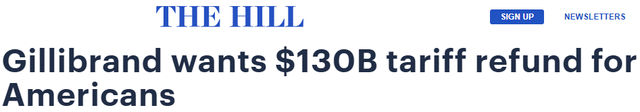 议员要求政府向消费者退款民主党籍联邦参议员克尔斯滕·吉利布兰德(Kirsten Gillibrand)周三举行线上新闻发布会,要求政府向小企业和消费者返还税款。她指出,美国企业和消费者承担了这些“非法”关税成本的96%,为联邦政府带来约1300亿美元收入。她要求财政部长斯科特·贝森特立即启动退款程序。