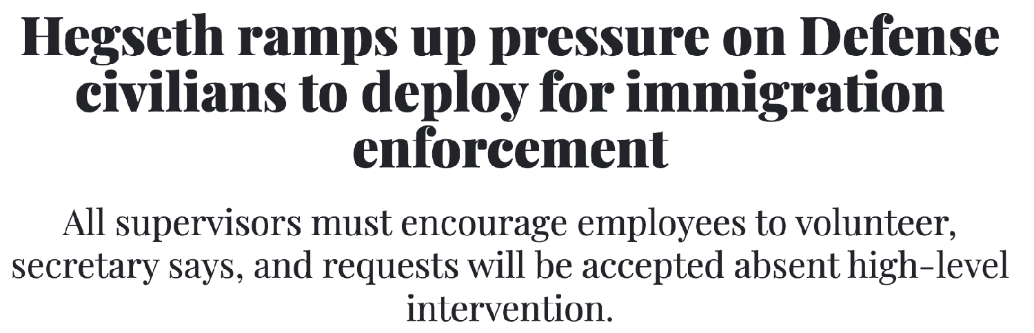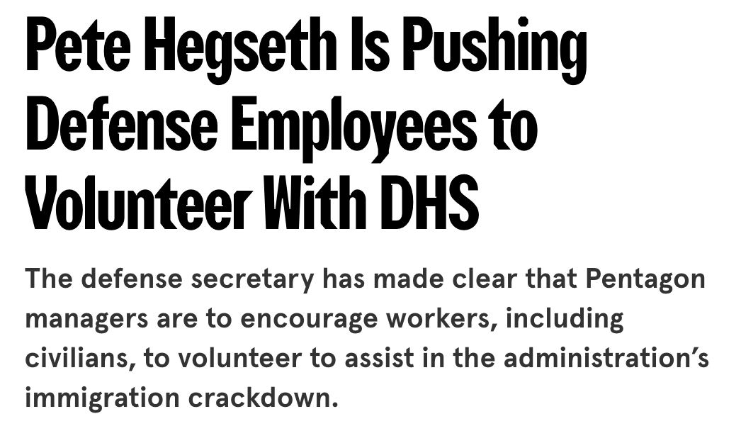 近期,美国国防部长Pete Hegseth签署了一份备忘录,鼓励五角大楼文职员工自愿参与国土安全部DHS的移民执法任务。这一举措迅速在联邦雇员中引发讨论。虽然官方强调这是“志愿性质”,但不少员工表示,在管理层不断提醒的情况下,这种志愿是否真正完全自愿,仍让人感到困惑。