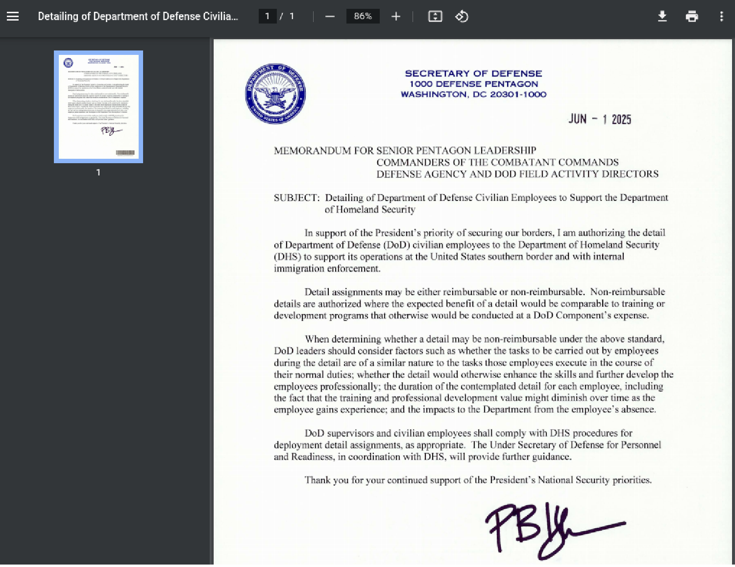 事实上,早在2025年6月,国防部就已经允许部分员工通过短期借调的方式前往DHS工作。但新的备忘录意味着,这项计划将被更加积极地推广。消息人士表示,这份文件已经发送给数千名国防部文职员工,许多部门主管也开始在内部会议中提及该项目。