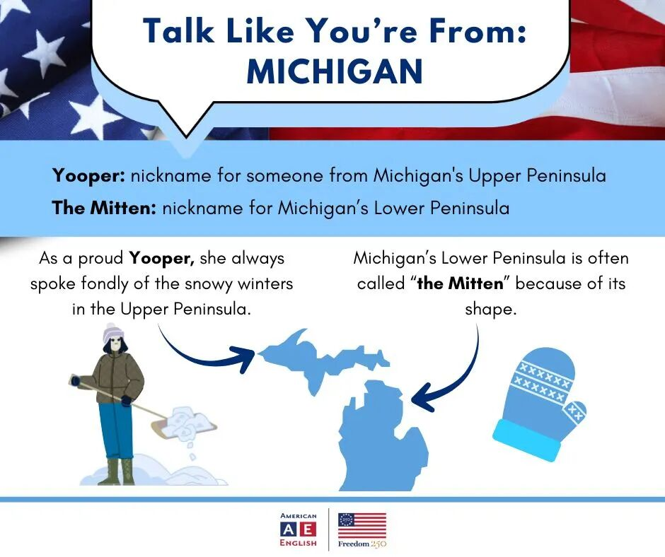 人们亲切地将来自密歇根上半岛的人称为“Yoopers”。这个词来源于“U.P.-er”(Upper Peninsula-er,即上半岛人)的发音拼写。