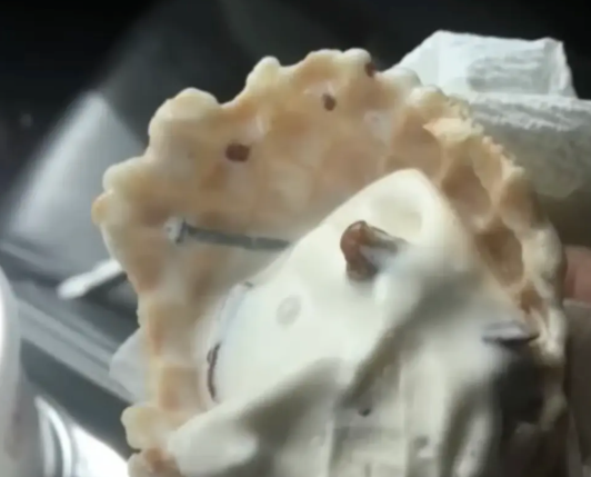 直到她的儿子提出想尝尝,当巴克利开始挖冰淇淋时,她才“注意到甜筒里竟然有一个金属钉,几乎是嵌入在甜筒里的。”
