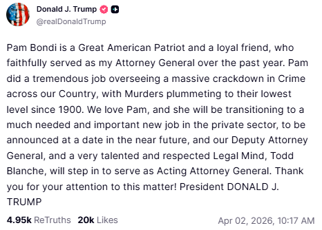 现年60岁的邦迪是川普近几周内解雇的第二位内阁部长,他在3月初已撤换了前国土安全部长克里斯蒂·诺姆。