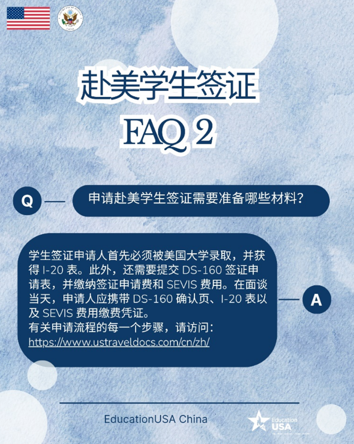 学生签证申请人首先必须被美国大学录取,并获得I-20表。此外,还需要提交DS-160签证申请表,并缴纳签证申请费和SEVIS费用。在面谈当天,申请人应携带DS-160确认页、I-20表以及SEVIS费用缴费凭证。有关申请流程的每一个步骤,请访问:https://www.ustraveldocs.com/cn/zh/