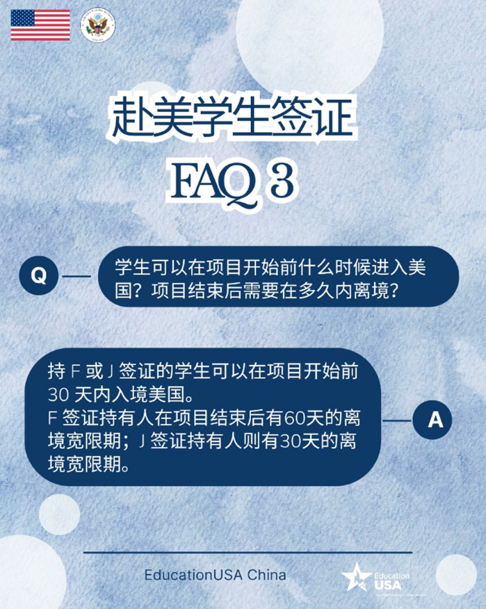 持F或J签证的学生可以在项目开始前30天内入境美国。 F签证持有人在项目结束后有60天的离境宽限期;J签证持有人则有30天的离境宽限期。