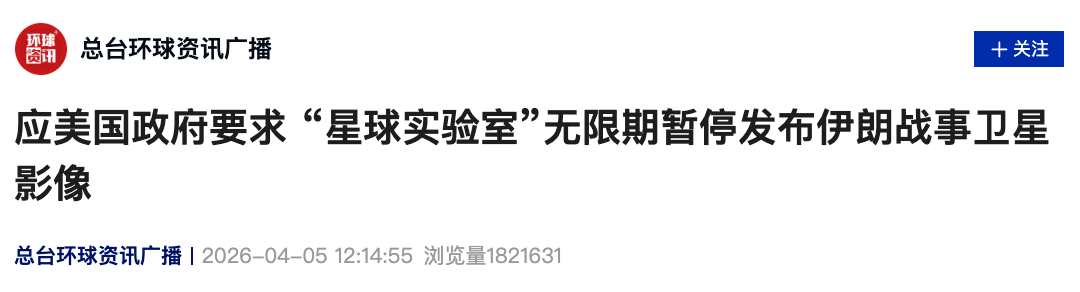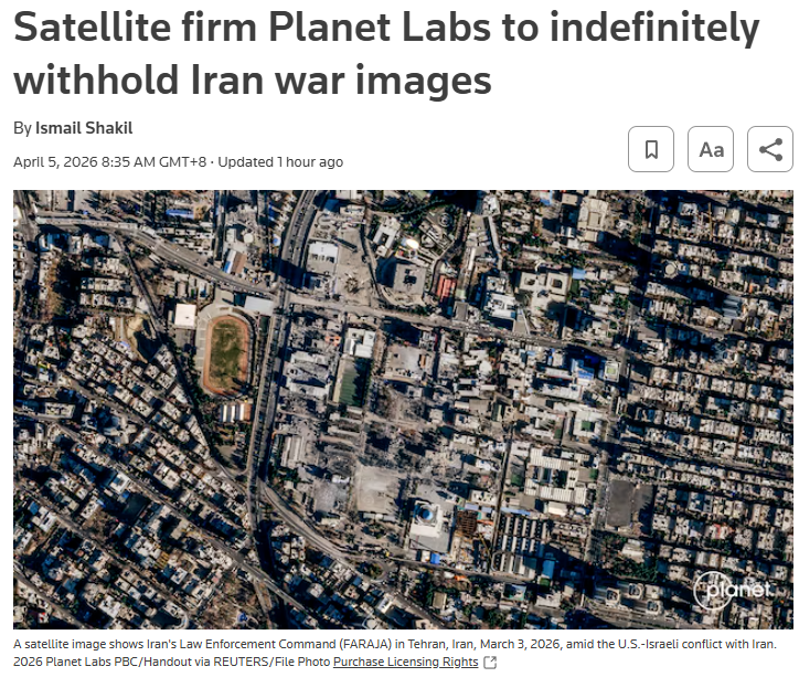 总部位于美国旧金山的一家遥感卫星数据公司——星球实验室(Planet Labs)4月4日宣布,应美国政府要求,将无限期暂停发布伊朗及中东冲突地区的卫星影像。
