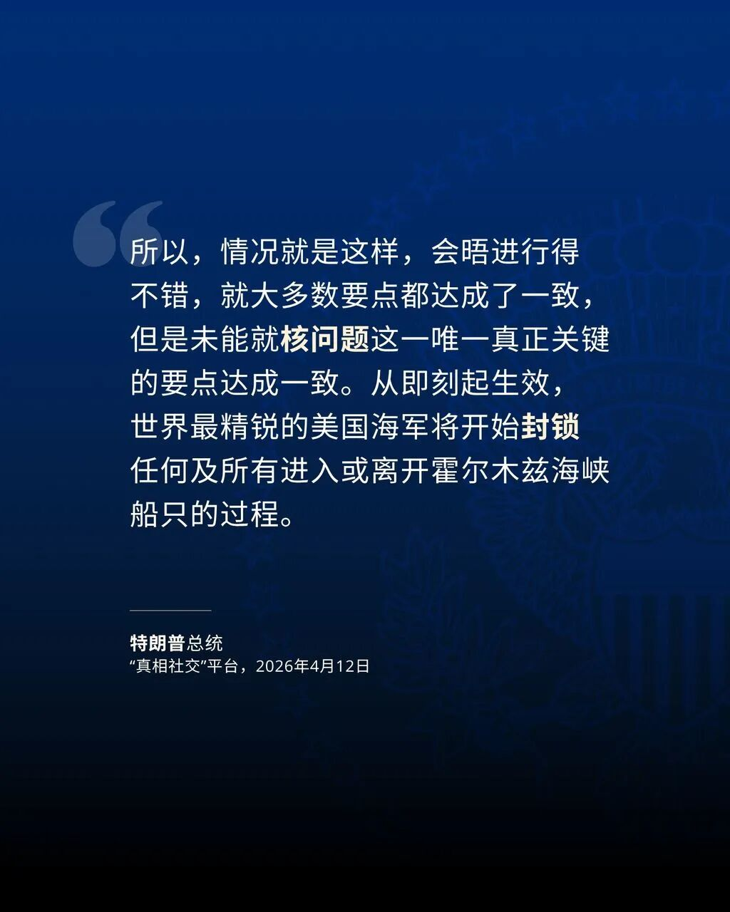 #特朗普总统 4月12日在“真相社交”(Truth Social)平台发文说:伊朗曾承诺开放霍尔木兹海峡,他们故意没有这样做。这给世界各地许多人和国家带来了焦虑、混乱和痛苦。他们声称他们在水里放了水雷,尽管他们的整个海军以及大多数“布雷船”都已经彻底被炸毁。他们或许真的这样做了,但是哪个船商会想要冒这样的风险呢?这给伊朗及其所剩无几的“领导人”的声誉带来巨大的耻辱和永久性的损害,不过我们早已超越了这一切。正如他们所承诺的那样,他们最好着手让这一国际水域尽快通航!他们正在违反每一项法律条文。关于在伊斯兰堡举行的会晤,JD·万斯副总统、特使史蒂夫·威特科夫还有贾里德·库什纳已经向我进行了充分的汇报。这次会晤得益于巴基斯坦陆军元帅阿西姆·穆尼尔以及总理沙赫巴兹·谢里夫慷慨且极具魄力的领导。他们是非凡的人物,并且不断感谢我避免了一场巴基斯坦与印度之间本可能会爆发的惨烈战争,从而拯救了三千万到五千万人的生命。听到这样的话总是让我很欣慰——其中所包含的人道关怀之深切不可思议。