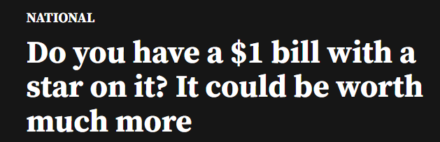 网购上的已确认销售数据显示,更常见的星号钞票也能卖到不错的价格——例如一张2006年发行的崭新的1美元星号钞票卖了30美元,或者一张1999年发行的5美元星号钞票卖了54美元——尽管远不及它们稀有的版本。