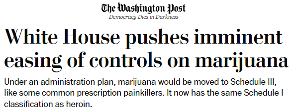 Axios率先报道称,政府正寻求尽快重新分类大麻的管制级别。