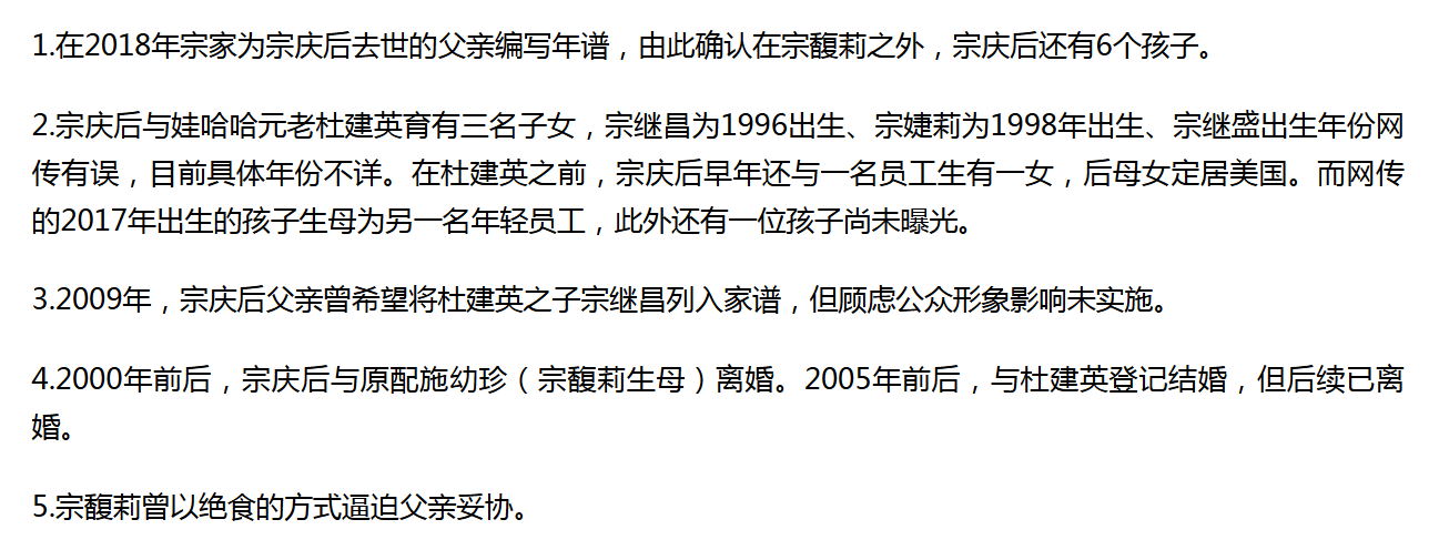 更令公众大跌眼镜的是,据凤凰网《风暴眼》报道,接近宗家的知情人士透露称,宗庆后不止这4个子女,在宗馥莉之外,还有6个孩子。
