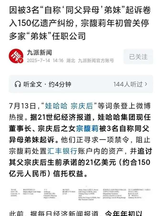 7月13日,宗庆后和宗馥莉一同登上了热搜榜,根据21世纪经济的报道,宗馥莉被三名声称是同父异母的兄妹起诉。在几天的时间里,主流的新闻机构也在进行报道,似乎一切都是风平浪静。
