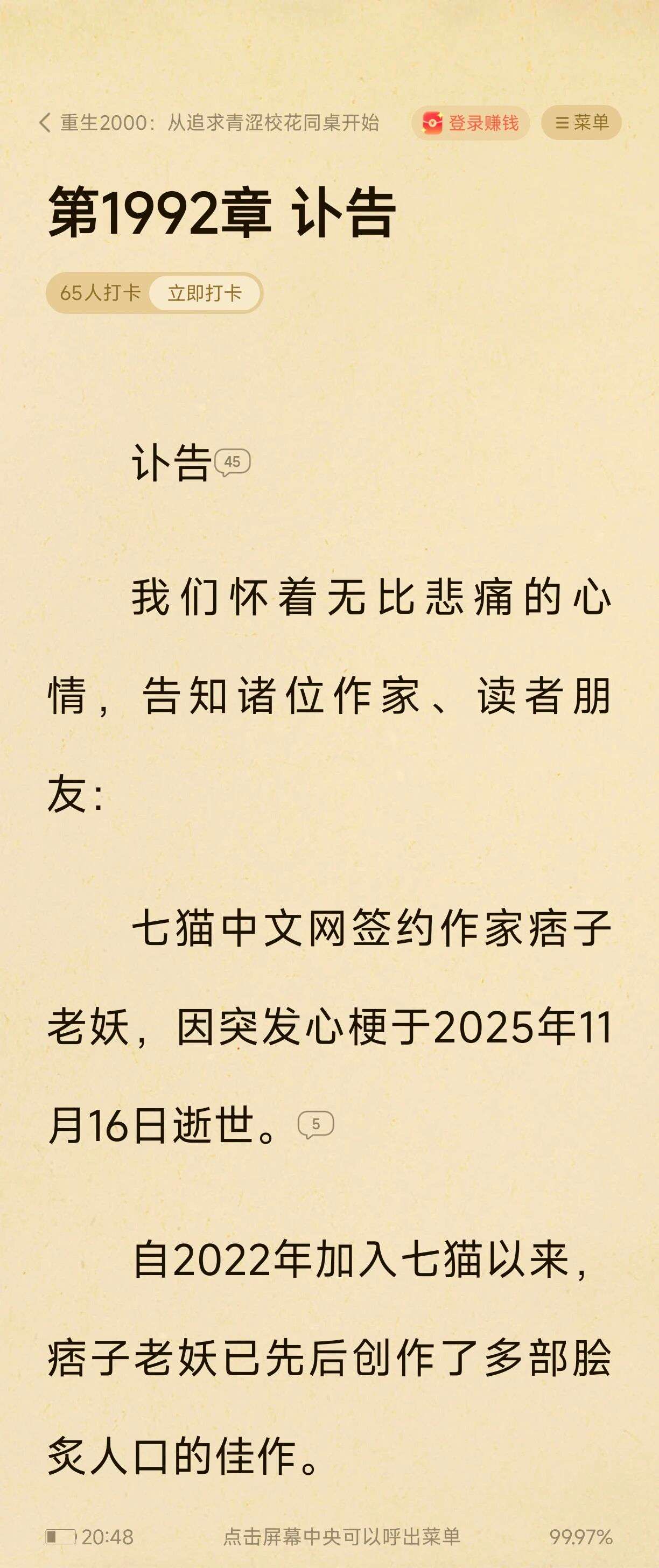 近日,多位网文博主发文称,七猫中文网签约作家“痞子老妖”于2025年11月16日因突发心梗离世。