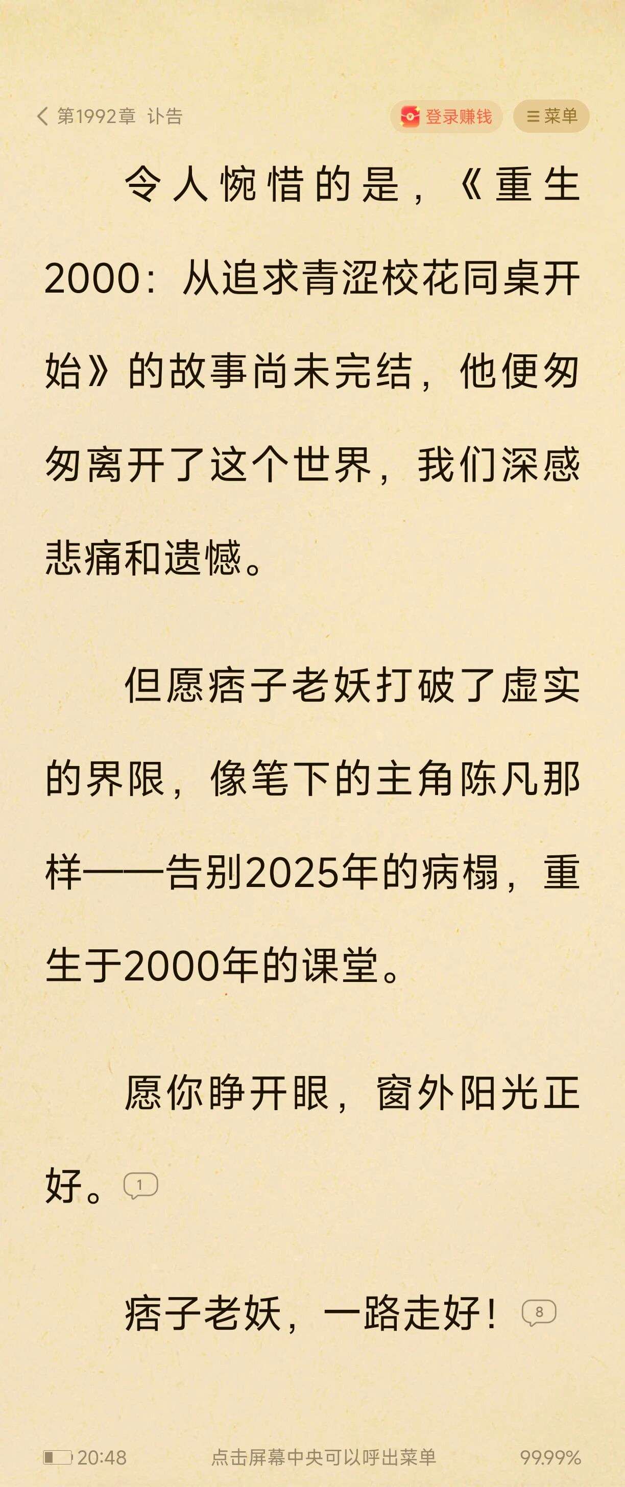 记者查询到,在其最后一部小说《重生2000》第1991章末尾,自称“痞子老妖”爱人的用户发布了一份讣告,称作者“痞子老妖”11月16日因为心梗突然离世,她帮“痞子老妖”为小说补充结尾。