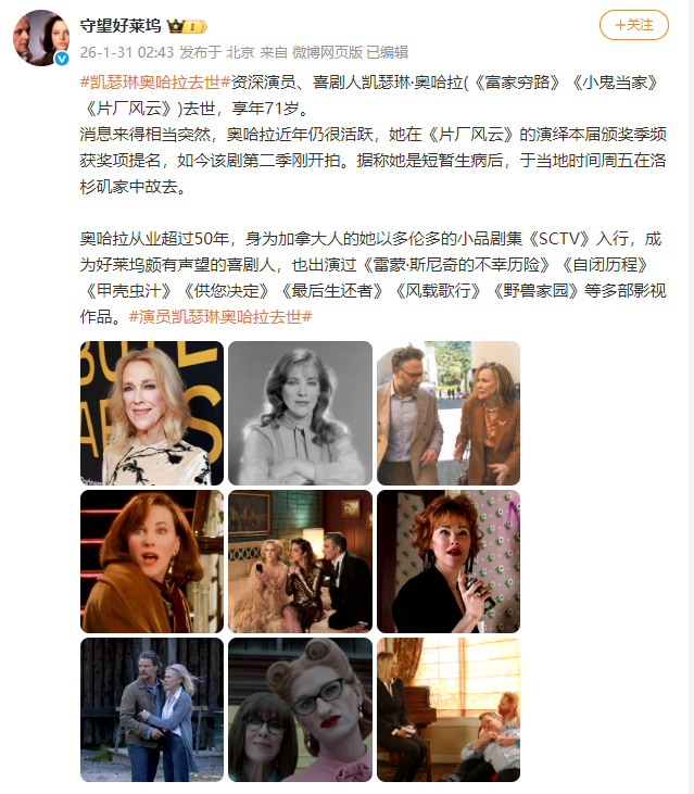 凯瑟琳·奥哈拉所属经纪公司发声明称,她于当地时间30日在家中因病去世。