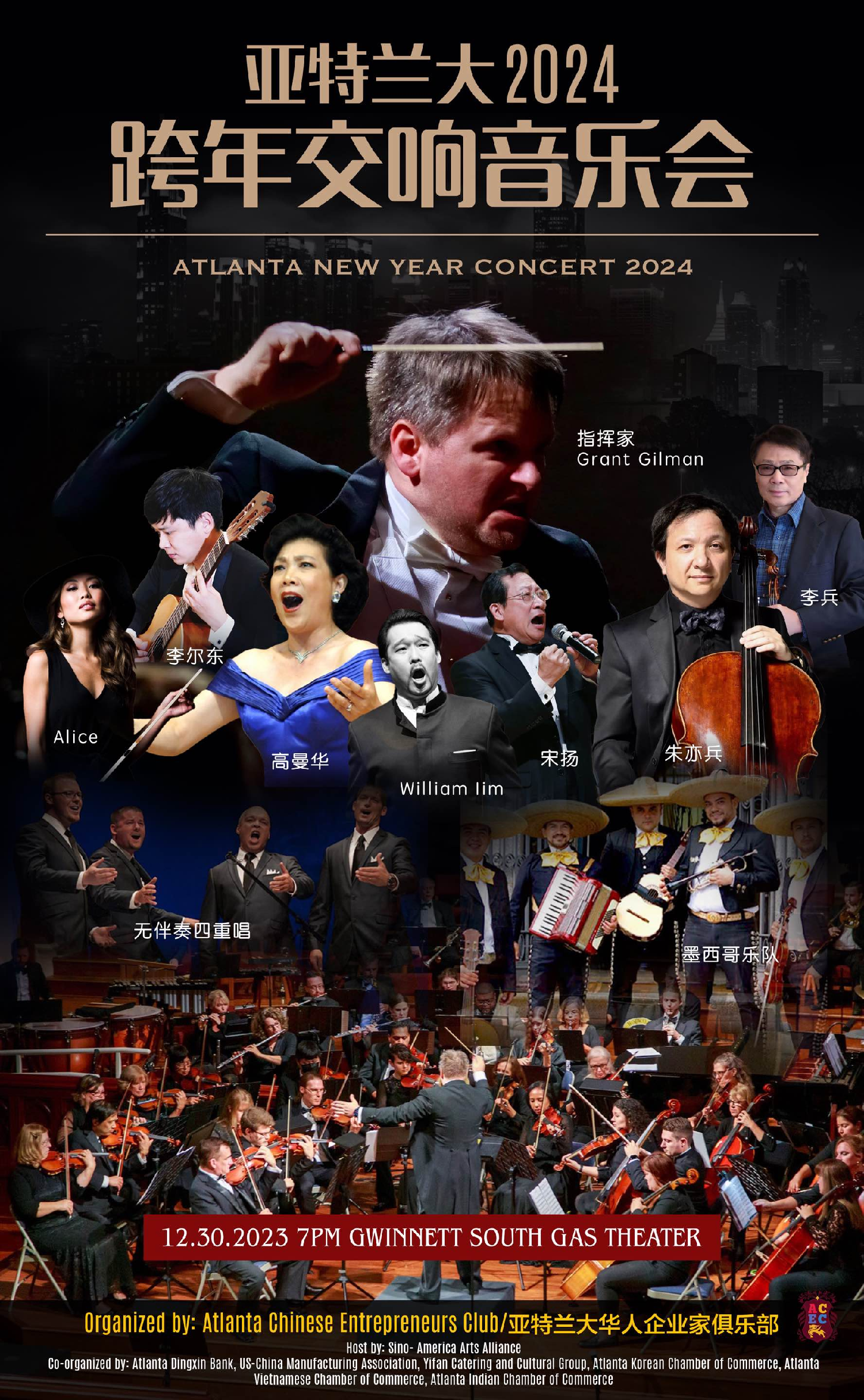 此次新年音乐会是由亚特兰大企业家俱乐部主办,北美亚裔艺术联盟承办,亚特兰大韩国商会、亚特兰大越南商会、亚特兰大墨西哥商会、亚特兰大印度商会、亚特兰大日本商会、鼎信银行、美中制造业协会、一凡餐饮文化集团共同协办的大型音乐晚会。音乐会将与主流社会相结合,携手不同族裔的文艺团体和艺术家,为社区和友人提供一个高品质的音乐盛宴。