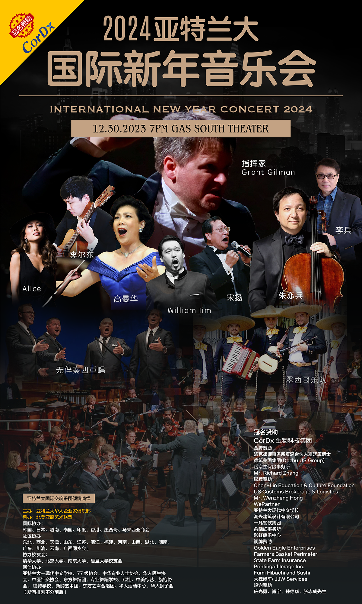 【美中报导讯】亚特兰大首届国际新年音乐会将于2023年12月30日在南方燃气剧院(Gas South Theater)隆重上演。这场专业高端、规模宏大的文艺盛会得到美东南和亚特兰大地区众多企业和社团的鼎力支持。据悉,赞助企业和协办单位名单还在不断刷新增加,为音乐会的筹办提供了有力的支持和巨大的动力。据不完全统计,目前赞助单位和个人有(排名不分先后):