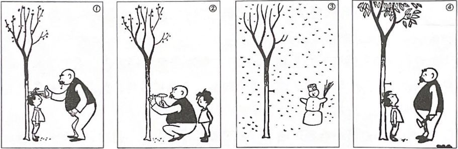 一段时间过去了。一天,下起了大雪,父子俩穿上大衣,到后院里去玩。儿子想看看自己已经长了多少,但是地上堆了厚厚的一层雪,儿子怎么量,都量不准。最后儿子放弃了,他和爸爸在树旁边堆了一个小雪人,回家了。