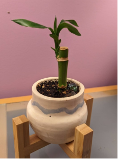 富贵竹是小小的一棵,差不多有三寸长。一棵富贵竹上长了三片短短的小叶子,另一棵富贵竹上面只有两片小叶子。叶子真是太小了,最长的也就只有一厘米大小。它们虽然小,但是我很喜欢,我在制陶课上,专门给它们做了两个漂亮的小花盆.一个花盆儿是球形的,圆圆鼓鼓的很可爱。我把它涂成了白色的,还加了蓝色的波纹。另一个花盆儿是葫芦形的,也是白色的,我是用了一个新学的方式去把颜色涂上去的。
