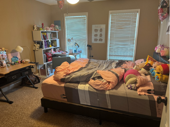 我卧室里面是好混乱。我的毯子非常杂乱无章。我有两张桌子,其中一张附着一个书架。书桌上挂着书架,是纯珍珠白的,书桌上放着一盏白色的灯。接下来,我们有我的另一张桌子,他是美丽的牛奶巧克力棕色和煤黑色。桌子上也有一盏灯。每一天,我喜欢从书架上拿起一本书,在床上看书。有时,我也喜欢在床上玩游戏!偶尔,我也喜欢在我房间里伸展和练习我的跆拳道!我房间里的其他一些东西是我的收集迷你人偶, 我已经有两个装满它们的陈列架!我有一个下抽屉, 上面放着一桶我喜欢的钻石画。我的床上和书架上有好多填充动物, 好像我有数十亿只动物围绕着我。