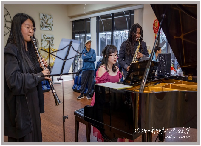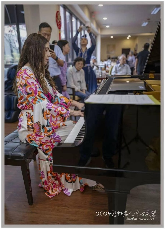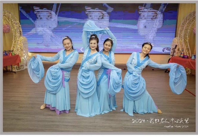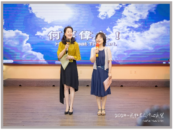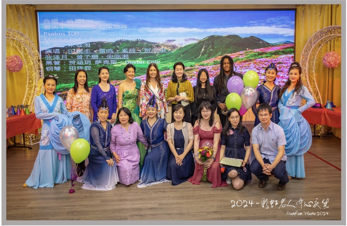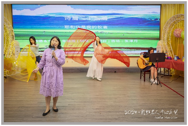 While watching the concert,some elderly attendees were engrossed,some casually ate and drank,and some chatted softly.Despite the noises and unexpected interruptions,the performers remained focused,dedicating themselves wholeheartedly to the heavenly Father and sharing the program with uncles,aunts,teachers,and friends there.One of the elegant hosts,Sister Lei,Yaqi from the Atlanta Chinese Bible Church,had a swollen face due to allergies,but miraculously recovered that day and no longer felt drowsy from antihistamines.The dance performer from Yunmeng Dance Troupe,Sister Wan,Hong,also expressed her thoughts,"Usually,we think volunteering warms and helps others,but little do we know that we are the ones benefiting the most.Seeing so many seniors positive and radiant,even the centenarian birthday stars are so cheerful and healthy,inspires and encourages me greatly!"