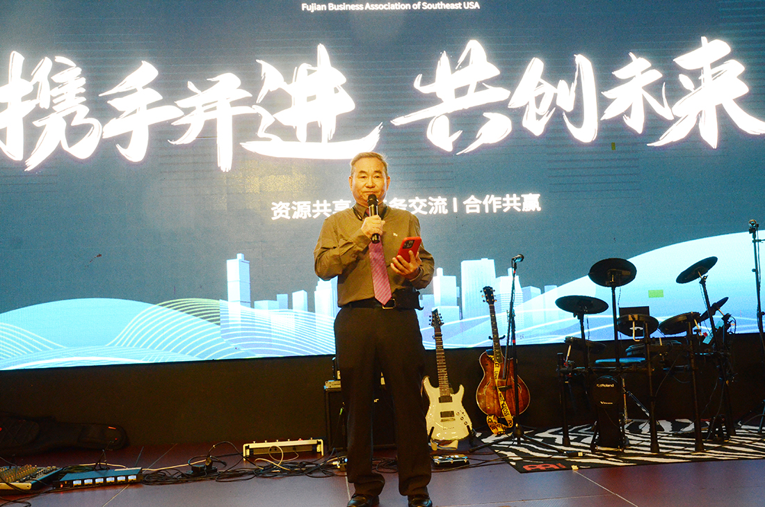 在颁奖典礼后,嘉宾致辞环节开始。美东南福建同乡会会长江通利在致辞中表达了对几位创立商会的年轻人的钦佩和赞赏,对商会的成就表示祝贺。他指出,福建商会和福建同乡会是你中有我,我中有你的关系。两个会分工虽然不同,但目标一致,都是为美东南地区的福建乡亲服务。他希望两会加强合作,共同努力推动各项工作的进展。