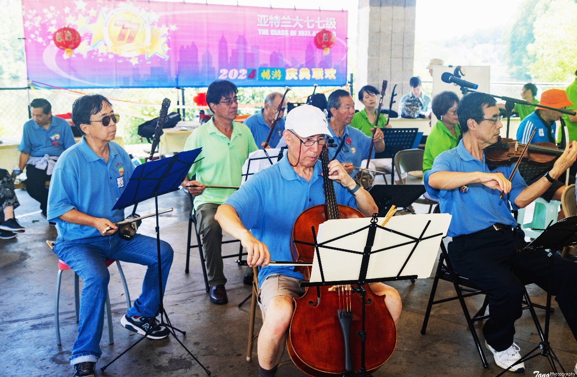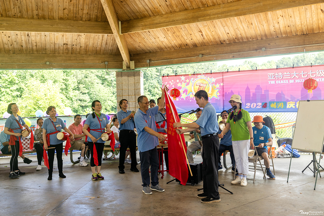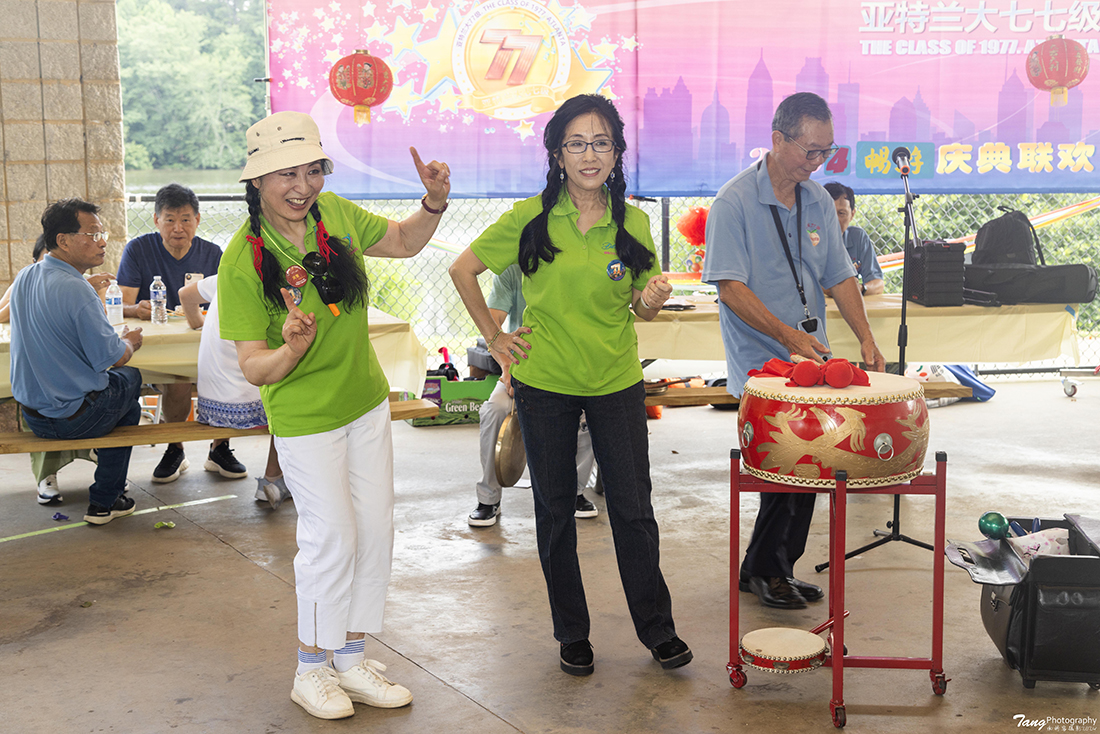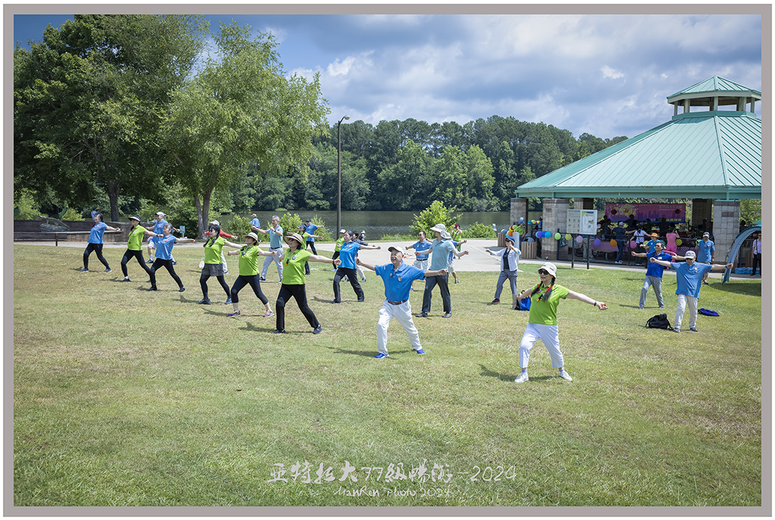 夏日的早晨,阳光温柔地洒在Collins Hill湖畔公园,湖边绿荫环绕,湖面波光粼粼,湖畔景色在晨光中格外迷人而生动,充满了夏日的活力与静谧。水面映出那一抹金色的阳光,为这场聚会注入了一丝童年的梦幻,微风吹拂着青草绿叶,仿佛轻声低语,述说着昔日的童年往事。湖边的大棚早已被亚城77级及舞蹈队的庆典横幅和五彩缤纷的气球装饰得喜气洋洋。欢歌笑语、音乐舞蹈、爽朗的笑声和友好的拥抱填满了大棚的每一个角落。