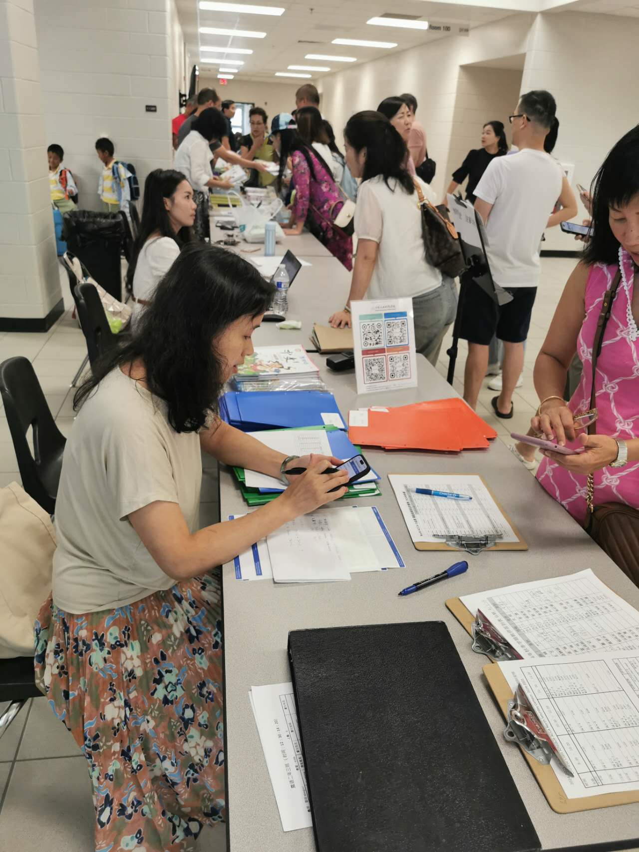 教室内的活泼气氛,映衬得走廊里格外寂静。然而,大厅这边还是热闹非凡。在校务办公区内,不少家长带着孩子来了解学校的中文课程。校务团队详细地向家长们介绍不同的中文课程,根据每个孩子的情况推荐合适的班级。许多学生家长们也都留在大厅里热烈交谈:有的是孩子们同班学习好几年了的老朋友交流暑期趣事,有的是新朋友互道问候,有的是老生家长为新生家长传授经验解答疑问。中文学校从来也不只是孩子们学习中文的学校,更是海外华人相聚的温暖社区。