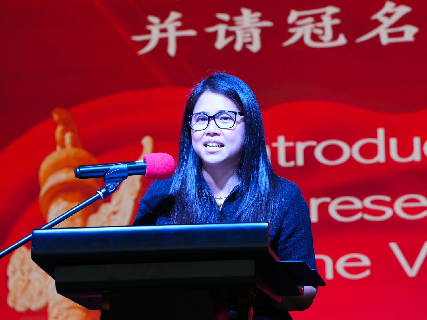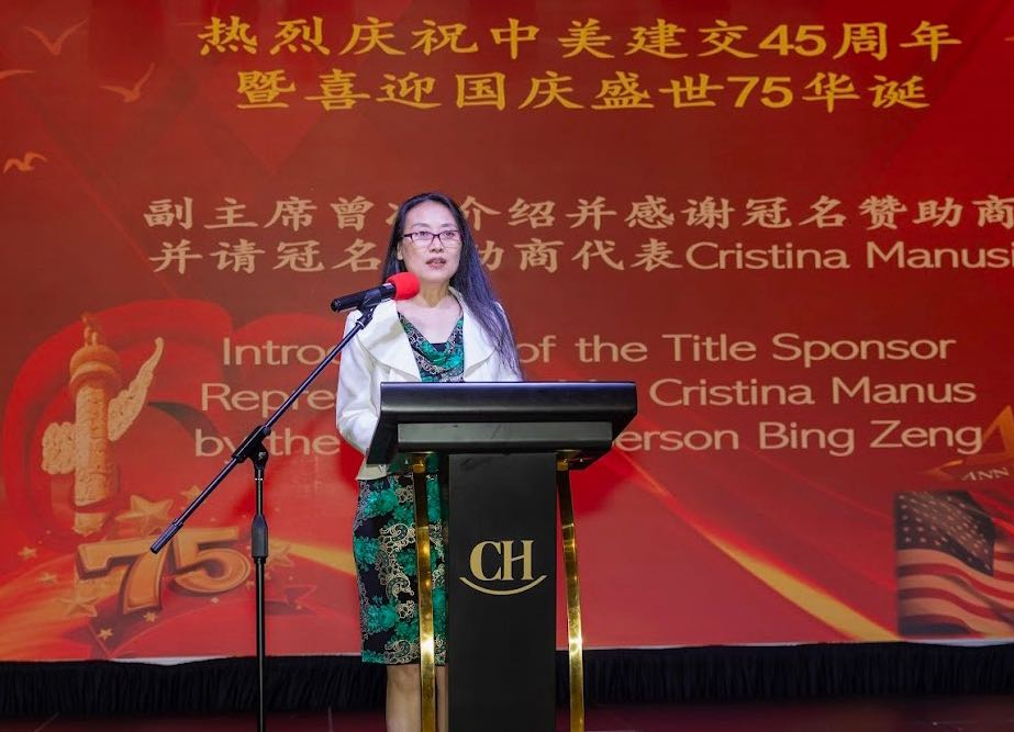 筹委会副主席中华专业人士协会会长曾冰介绍并感谢冠名赞助商,请冠名赞助商代表Cristina Manus致辞,Cristina Manus诚挚祝贺庆典并介绍了CorDx的情况及对社区的贡献。她说,美中关系的故事是合作、伙伴关系和共同进步的故事。我们共同应对挑战,拥抱机遇,并为在相互尊重和理解的基础上蓬勃发展的未来奠定了基础。这45年见证了贸易、技术、文化,当然还有创新的显着增长,为我们这样的企业的蓬勃发展奠定了基础。