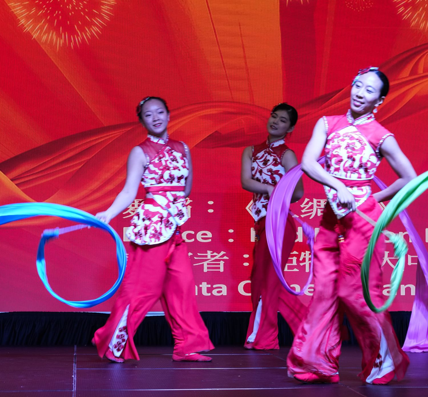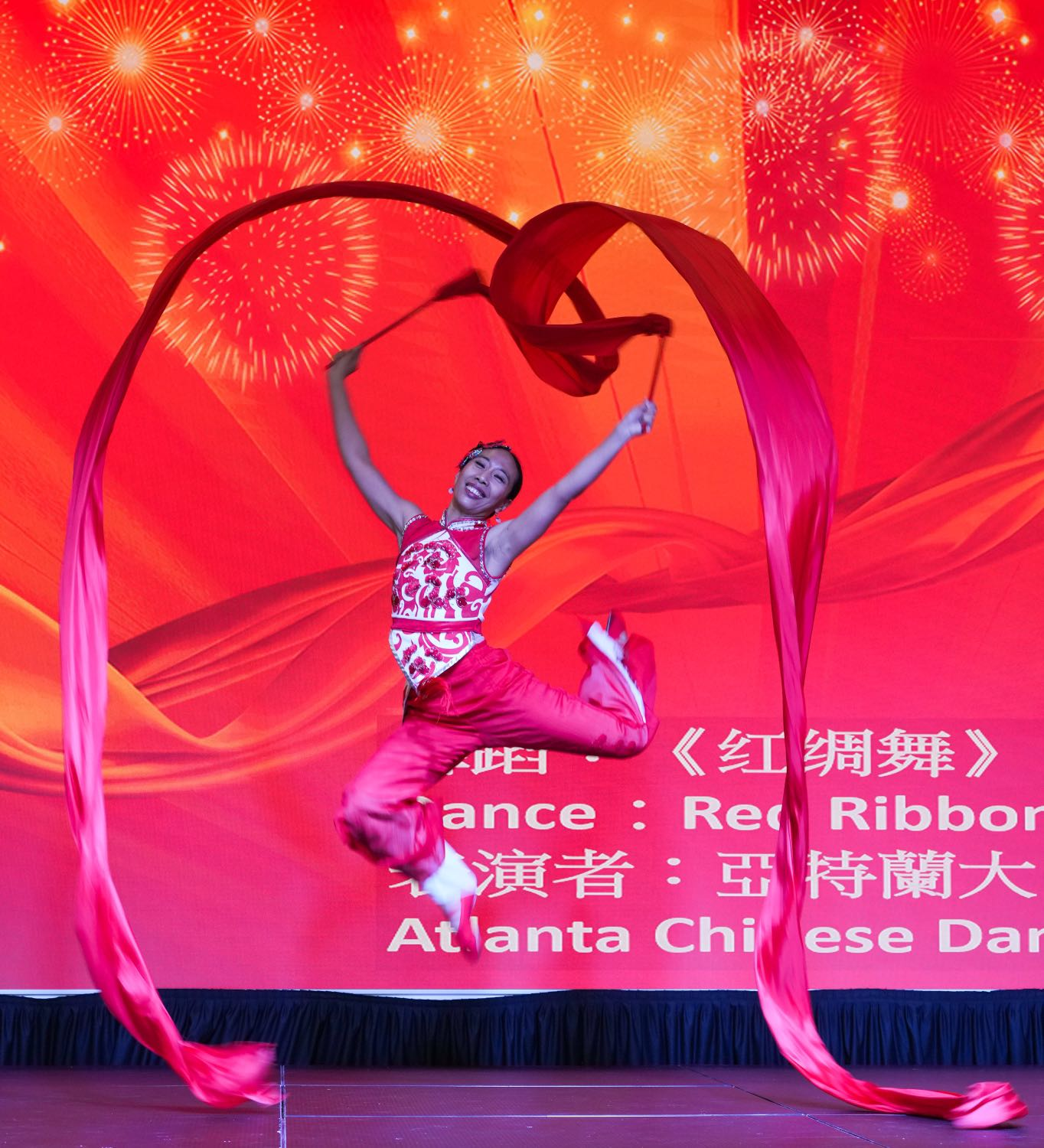 首先是亚特兰大中华舞蹈社表演的欢乐的《红绸舞》。由毕业于英国皇家舞蹈学院的舞蹈家叶慧莹创办的中华舞蹈社已经走过三十三年历程。该舞蹈社一直推广中国古典和各个民族民间舞蹈。他们刚刚在一天前公演了二场舞蹈演出《生活中的英雄》,他们的每一次大型演出都得到很高的评价。叶慧莹的女儿李凯妮的舞蹈编创得到美国舞蹈界的认可、重视和支持。李凯妮在《红绸舞》中担任领舞。