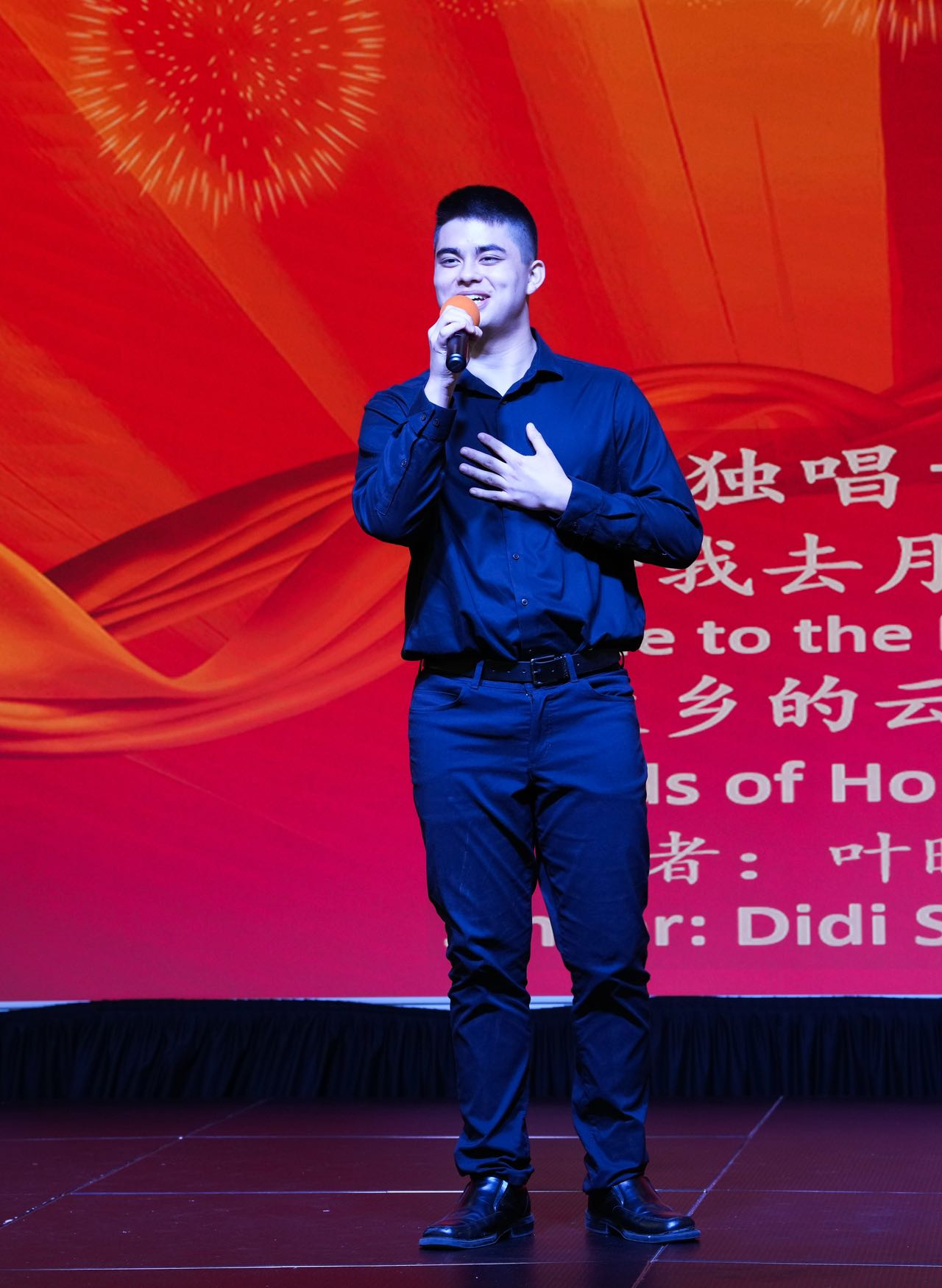 接着是中美混血音乐专业大学生叶暾的男声独唱《Fly Me to the Moon》和《故乡的云》。叶暾是一位饱受中西方文化熏陶的音乐大学生,母亲是来自马来西亚的钢琴家,父亲是美国企业家。他对音乐的领悟达到了一个至高的境界。去年他获得全额奖学金考入了音乐学院,主攻小提琴专业,而他对声乐的追求,从高中时代就从来没有停止过。在音乐学院他也把声乐作为副科选修。他的中英文吐字清晰,旋律流畅,音色圆润优美。在经久不息的掌声后,他又返场清唱了一段《You Raise Me Up》。