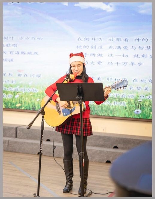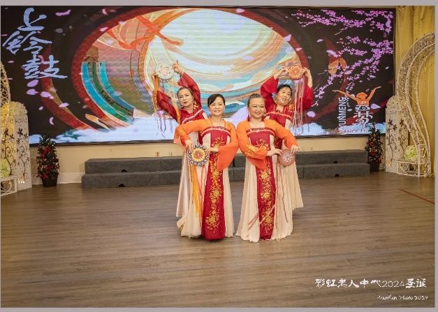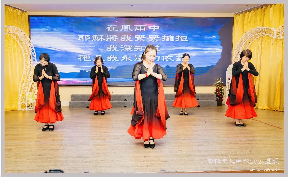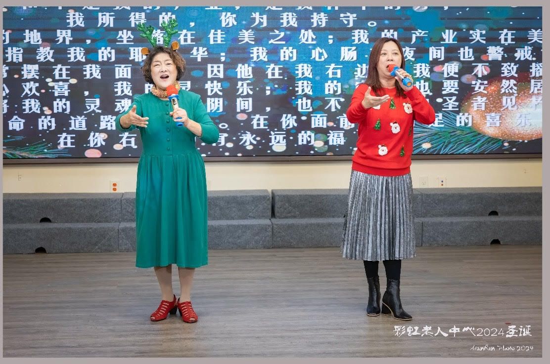 茉莉花小合唱组合(陈文莉、覃立新、曾雪华、张俊、YL、张弛、薛继红、SUSAN)以深情款款的《平安夜》和欢乐轻快的《我们祝你圣诞快乐》开启了音乐会的第一篇章,用和谐的歌声传递出圣诞的真谛----和平与爱。随后亚城戏社的伊娜社长与章小白女士别出心裁地用越剧演绎了《诗篇16》。用越剧演绎《诗篇16》是一种创新的表达方式,将传统越剧艺术与信仰内容结合,为彩虹中心的老人们带来了耳目一新的体验。越剧以其柔美的唱腔和细腻的情感表达著称,通过它来诠释《诗篇16》的内容,既保留了圣经诗篇的神圣与庄重,又增添了东方艺术的独特魅力。伊娜老师和小白老师通过婉转的唱腔、优雅的身段和深情的表演,展现了诗篇中对神的信靠与赞美之情。她们的演出不仅是一次文化的融合,更是一种艺术上的突破,赢得了现场观众的热烈掌声。接下来的田佳奕(词曲钢琴伴奏)与张泽月(词唱吉他伴奏)合作演绎了原创圣诗《在耶和华的穹苍赞美》,其动人的旋律和深刻的歌词颂扬了主的伟大。亚特兰大中文基督教会灵粮堂姐妹团队表演的舞蹈《恩典的记号》,则用舞姿生动地诠释了信徒在主里所经历的奇妙恩典,充满了感染力与灵性。