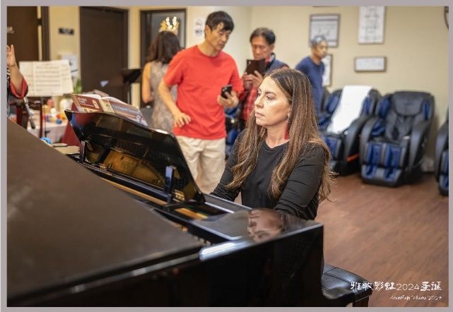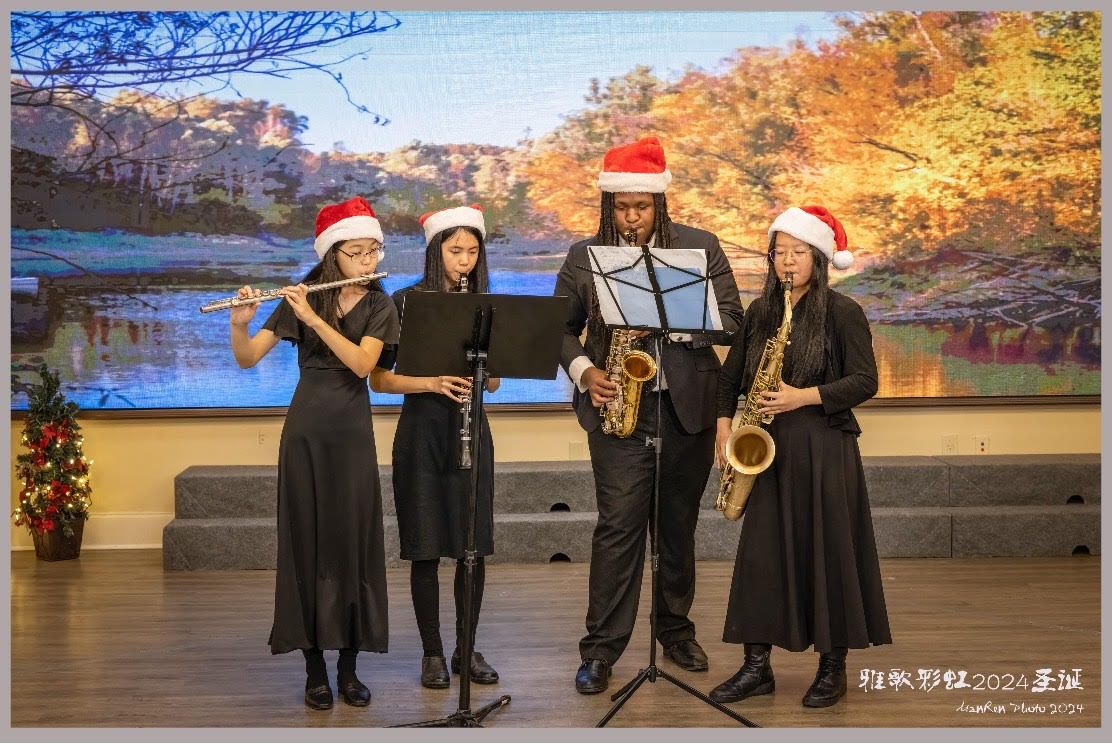 来自亚特兰大桃树城的女高音张弛独唱的《圣母颂》以澄澈而温暖的嗓音,赞美了圣母马利亚的信实与顺服,将观众带入了对主的沉思和敬拜中。张弛的演唱不仅展现了其精湛的艺术功底,也深深打动了在场的每一位观众。《圣母颂》作为舒伯特的一首不朽之作,以其优美的旋律和深刻的情感流露被视为圣乐的经典之作。张弛在演唱中注入了她对信仰的理解与敬意,使观众在歌声中体会到了对主的敬拜与对圣母的颂扬。她动人的演绎将音乐会的氛围推向了新的高度,为整个活动增添了一抹神圣的光辉。贝多芬六代弟子Mischa Yoo在音乐会上以爵士风格的钢琴独奏重新演绎了经典圣诞曲目《God Rest Ye Merry,Gentlemen》。她将传统旋律与爵士元素巧妙融合,以即兴的节奏和丰富的和声赋予这首乐曲全新的生命力。琴声时而轻快跳跃,时而深情悠扬,仿佛在诉说圣诞故事中的平安与喜乐。Mischa Yoo的演奏既保留了圣诞经典的温暖,又注入了现代音乐的活力。她独特的演绎让观众耳目一新,在熟悉的旋律中感受到全新的情感表达,为整场音乐会增添了一份别具一格的动感与魅力。云梦舞团的舞蹈《上铃鼓》以轻快的节奏、优美的舞姿,展现了节日欢乐的场景。MUSIC ARTS CLUB的高中生们——贺玥菡、Dexter Cole(萨克斯)、洪苗(黑管)、李司田(长笛)合作演绎的《Waves of the Danube(多瑙河之波)》则为观众们带来了经典圆舞曲的新活力。
