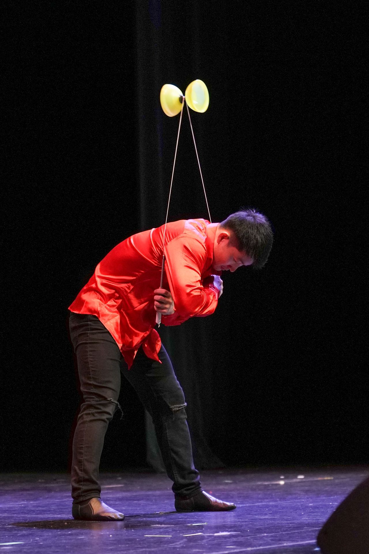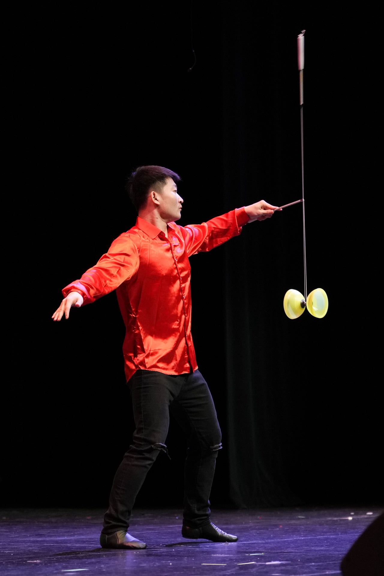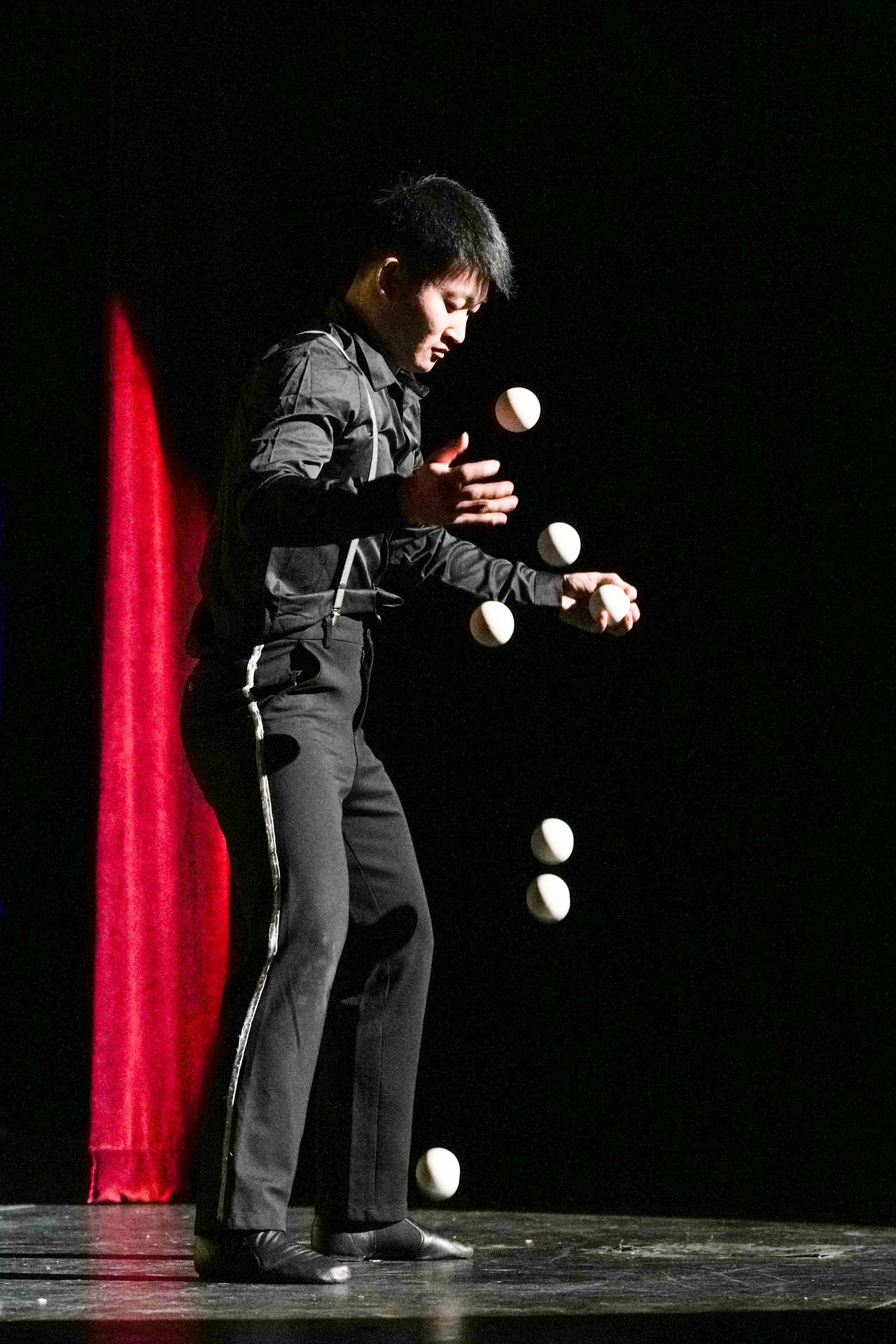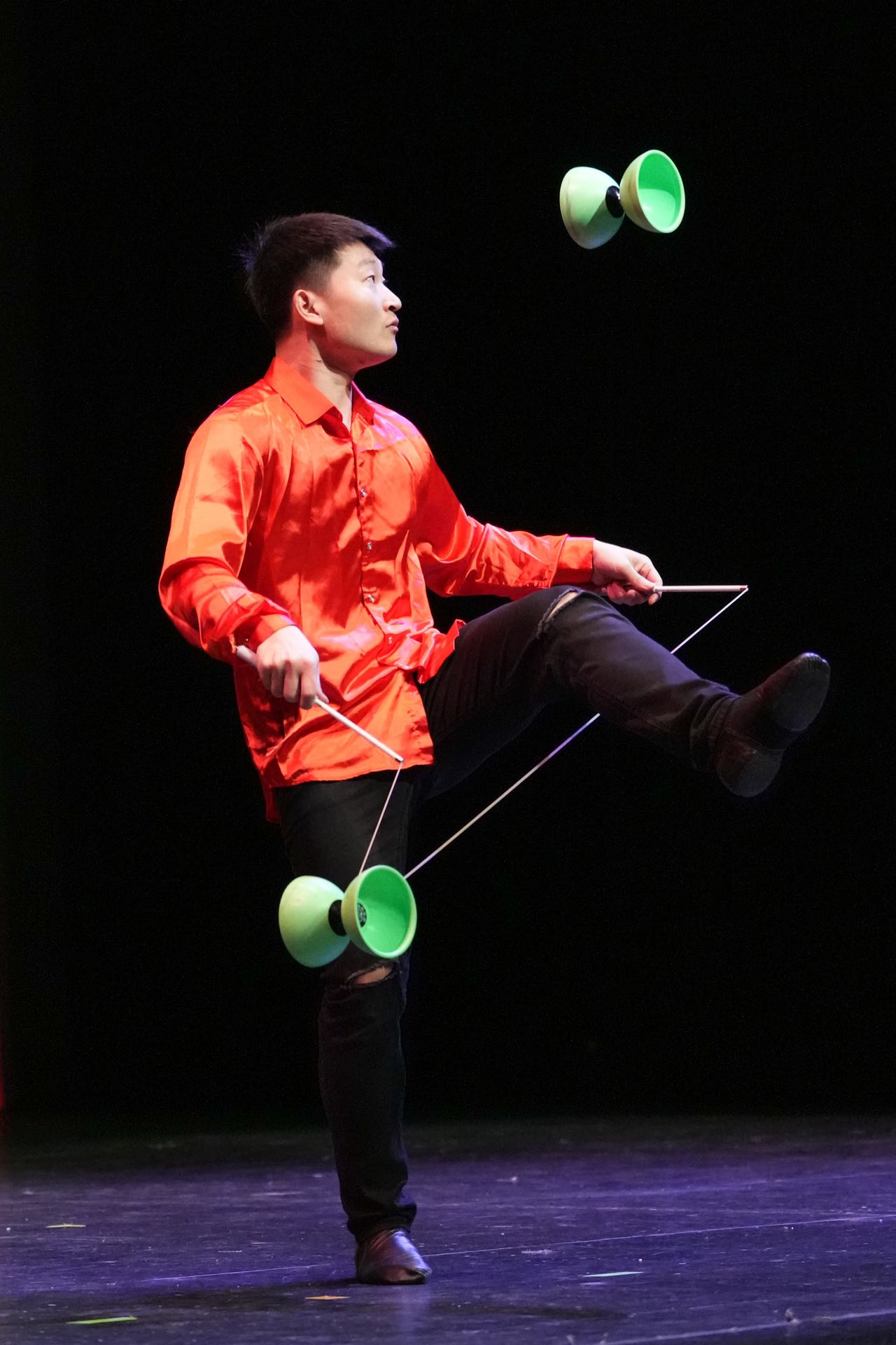 他以娴熟的技巧表演了多达7个皮球的连环抛、弹、接的《花式球技》以及各种炫技的抖空竹。