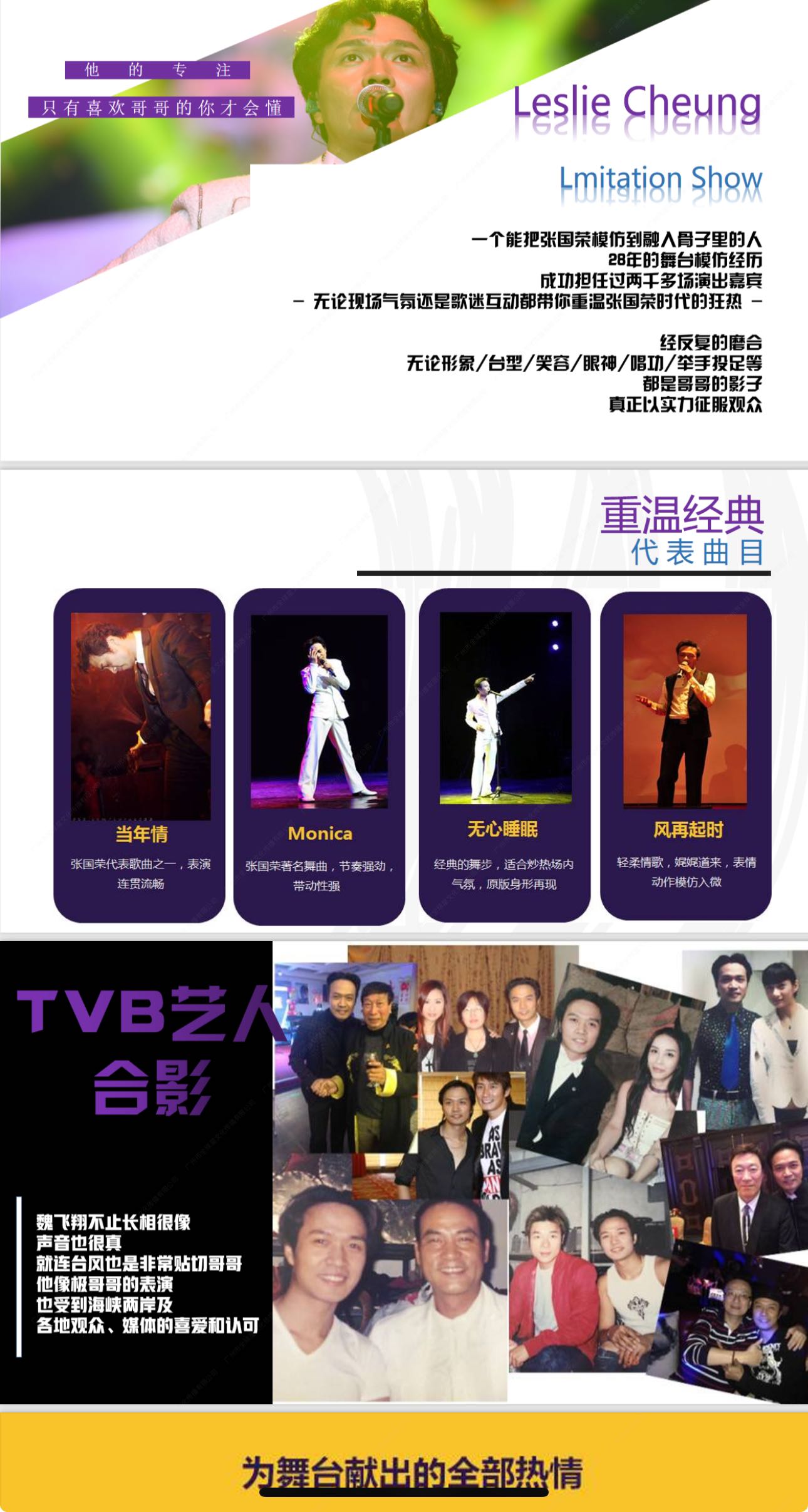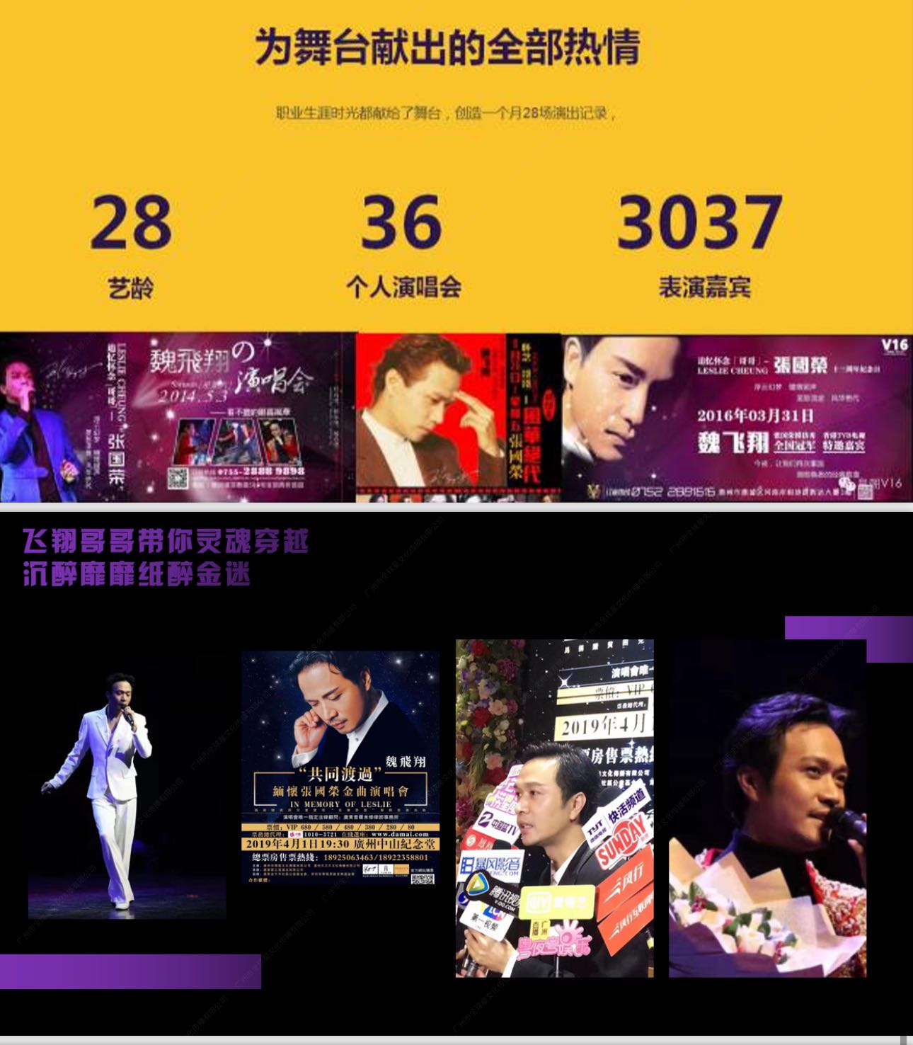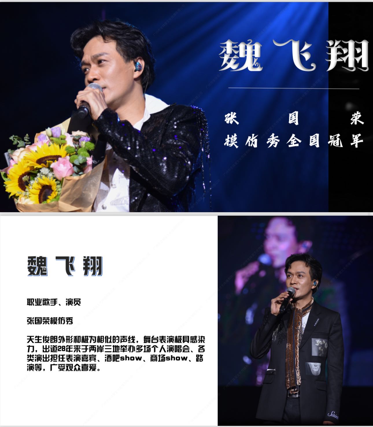 魏飞翔自出道以来,凭借天生俊朗的外形、极为相似的声线,以及极具感染力的舞台表演,深受观众喜爱。出道28年间,他在两岸三地举办多场个人演唱会,还多次在各类演出中担任表演嘉宾,演艺经历十分丰富。