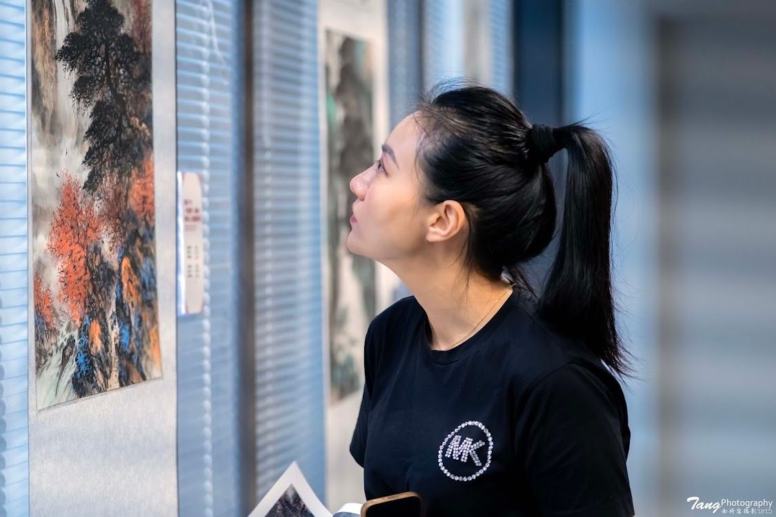 画展第一天,星期五。下午4时许,观众带着对中国国画的热爱,带着对岭南画派这位杰出画家的仰慕之情,从四面八方纷至沓来。Johns Creek活动中心已成为青绿飘逸的画廊:黄鹤峰的《春》《夏》《秋》《冬》,《怡心》《尚志》《无为》,还有《惠和》《乐道》《观自在》等系列画作,让人如入仙境,目不暇接。展厅内人头攒动,有的在画前凝视欣赏,有的在画旁拍照留念,还有的请黄先生在赠送的画册上签名盖印。