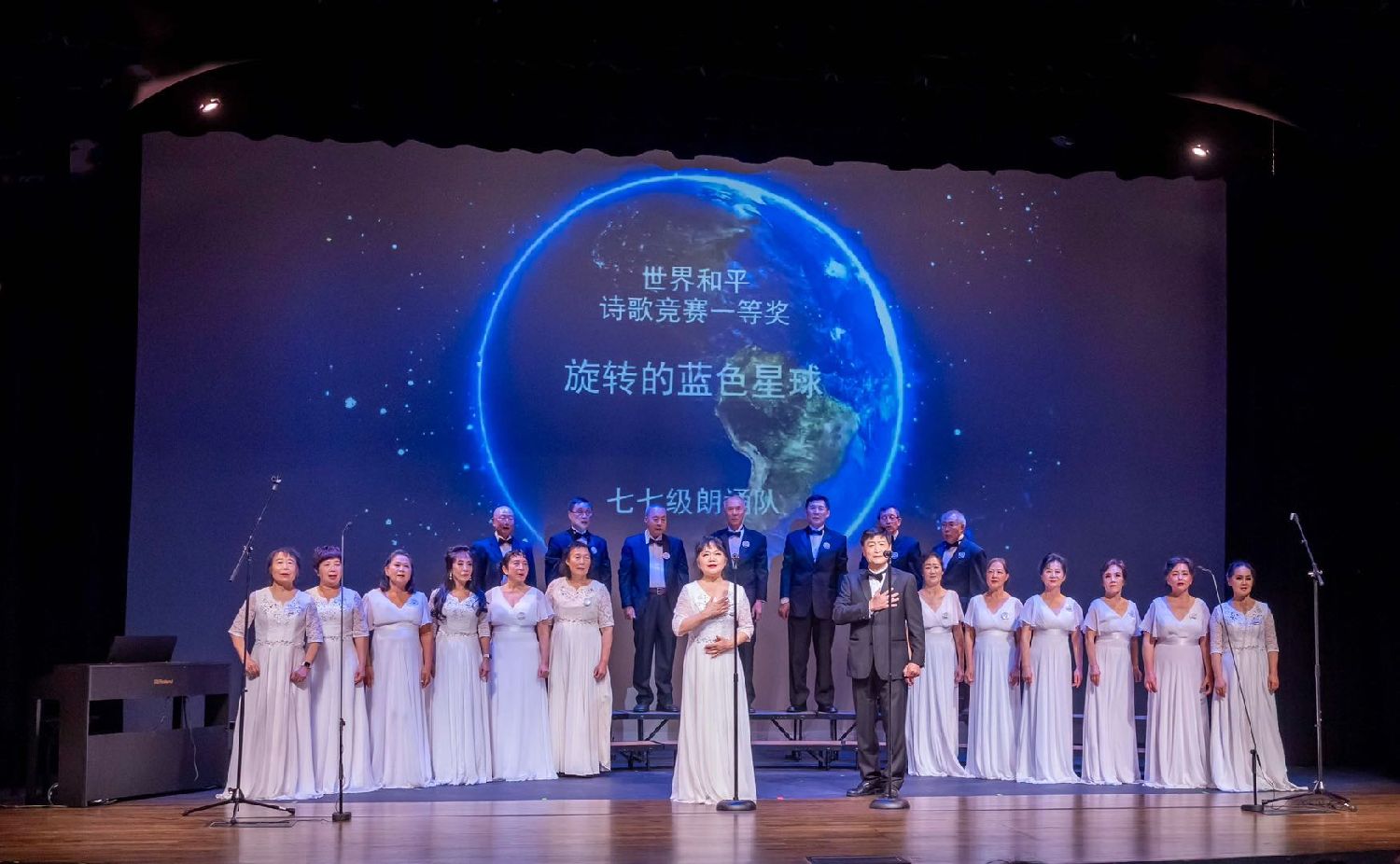 由新韵和77级朗诵队合演的集体诗朗诵《旋转的蓝色星球》,用连续低沉的吟诵“蓝色、星球”营造出无垠的星空意象,在战火荼毒的星球上,有和平鸽承载着文明之光,祈愿我们的家园永远温馨。